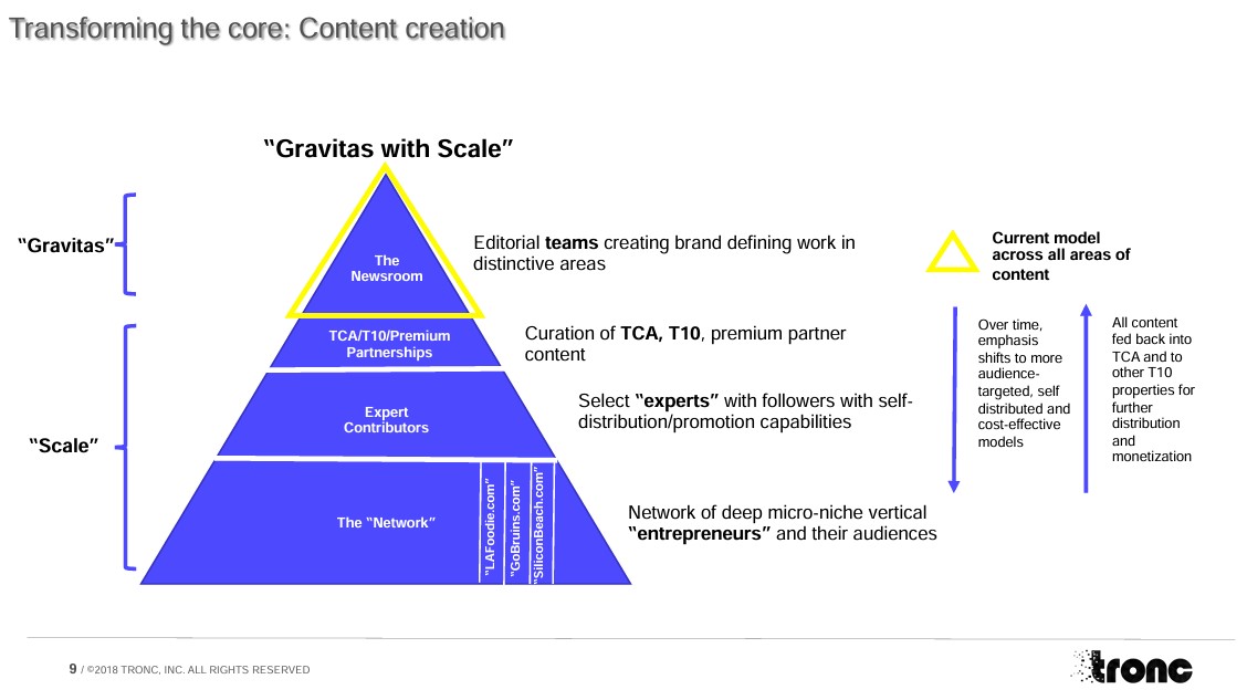 Amid a cinematic sequence of a dramatic union campaign unfolding under a wave of management repression and ineptitude at The Times, it might be hard to remember that Tronc had an actual business plan: a scheme, if you will, in a the shape of a three-sided pyramid, that involved a little pyramid of existing journalists doing boring regular journalism on top of a bigger pyramid of deep micro-niche vertical entrepreneurs and their audiences doing digital stuff. It was called “Gravitas with Scale.”